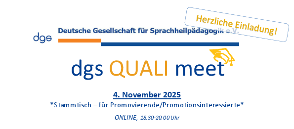 QUALI meet ist als virtuelles Graduiertenkolleg der Deutschen Gesellschaft für Sprachheilpädagogik e.V (dgs) ein Treffpunkt für diejenigen, die sich wissenschaftlich im Bereich der Sprachheilpädagogik qualifizieren (möchten).