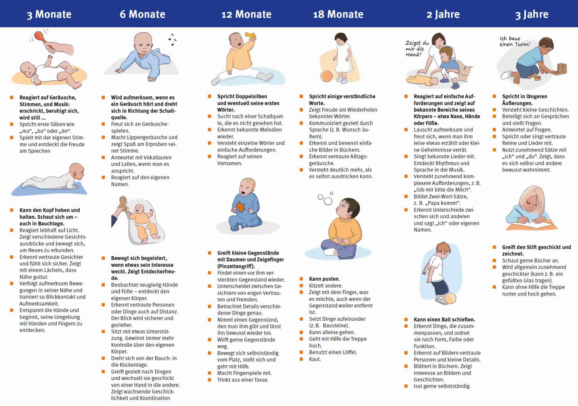 Auf einer DinA-4-Seite finden Sie eine mit einfachen Bildern gestaltete Übersicht zu den wesentlichen Meilensteinen in der kindlichen (Sprach)Entwicklung vom Säuglingsalter bis zum 3. Lebensjahr.